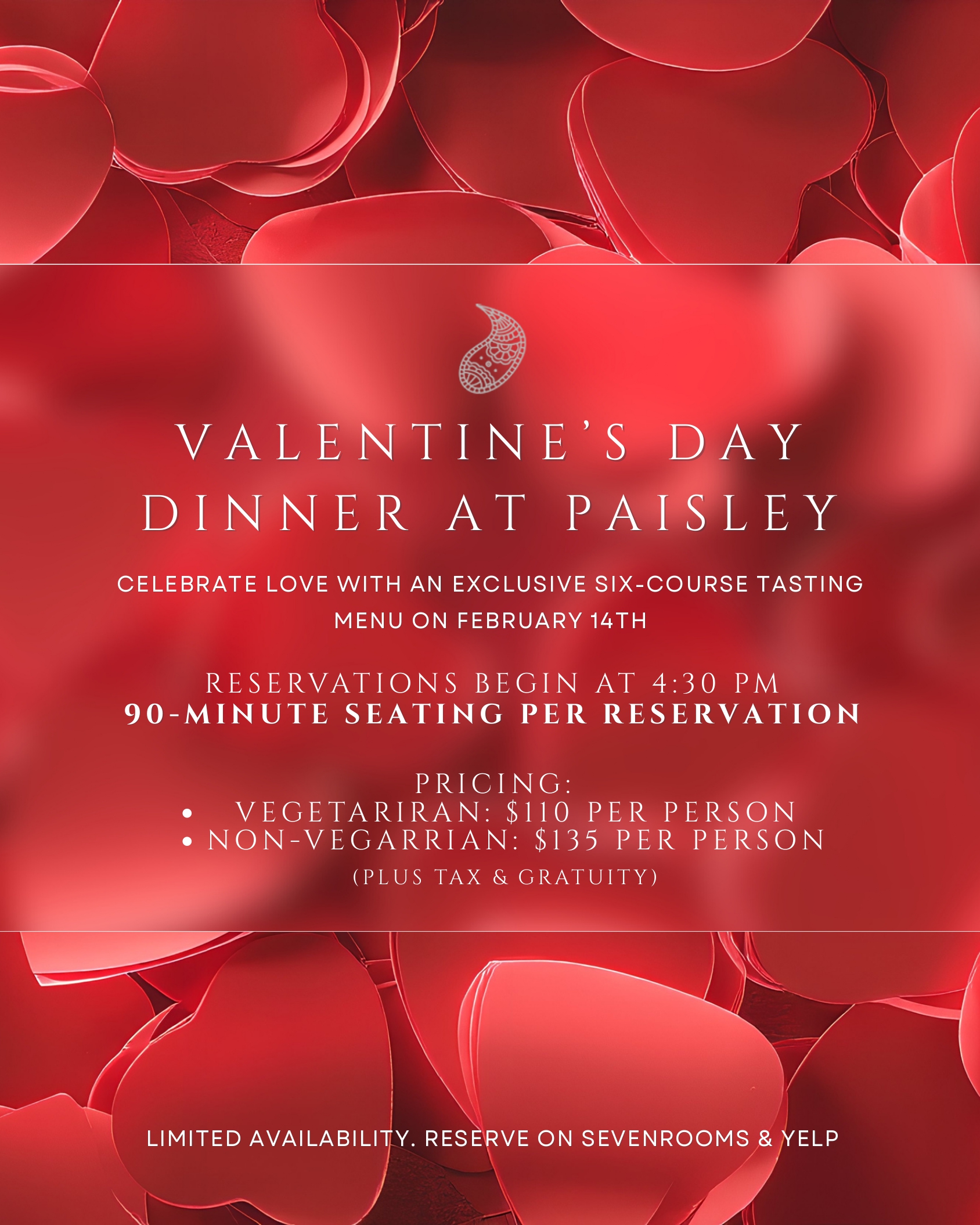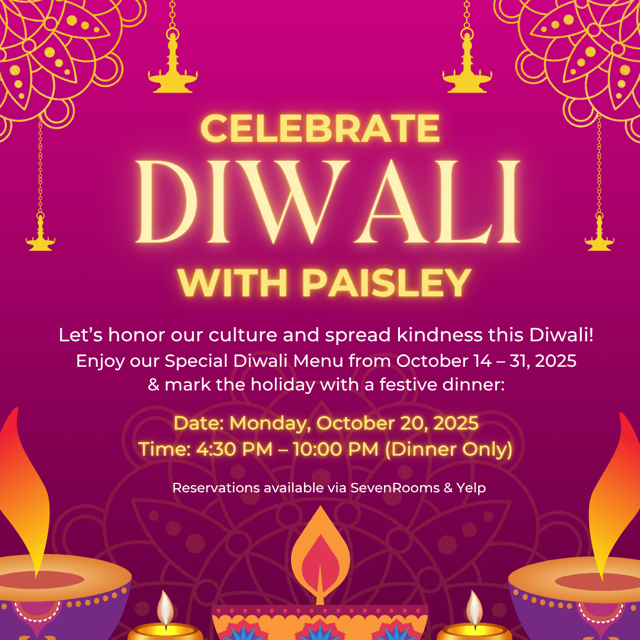 Paisley explores the subcontinent’s diverse culinary offerings. For the menu, we bring creativity and excellence in crafting flavorful, healthy dishes. Introducing an extraordinary blend of authentic regional Indian flavors and innovative culinary techniques to New York City's discerning food lovers. The cocktails are equally varied in their inspiration. There is also an extensive wine and beer list in addition to a wonderful dessert menu.